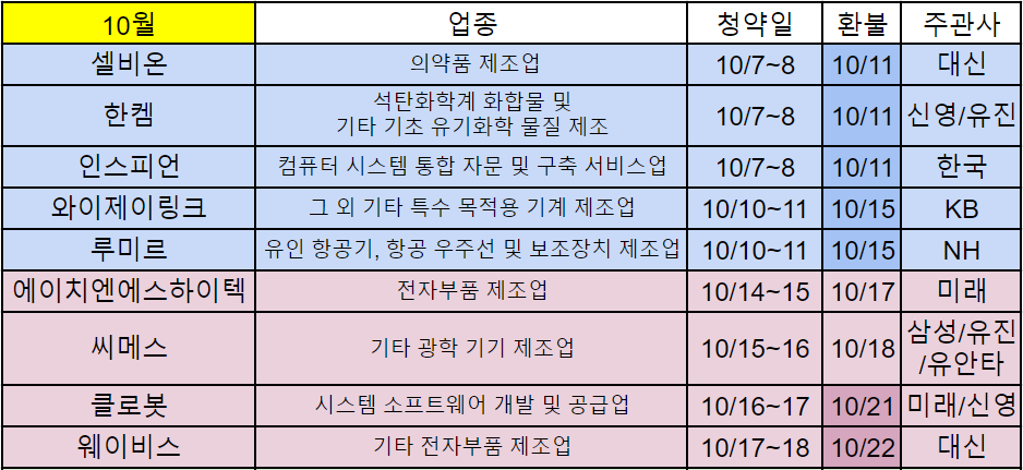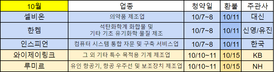 파랑 3 종목(셀비온, 한켐, 인스피언)의 청약 일정이 완전히 겹치고, 환불일 +3일인 10월 11일에 환불됩니다.
